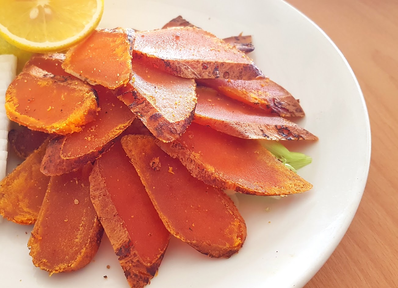 精緻餐點供您享用。我們吃的這個是塗有焦糖並烘烤的Bottarga。