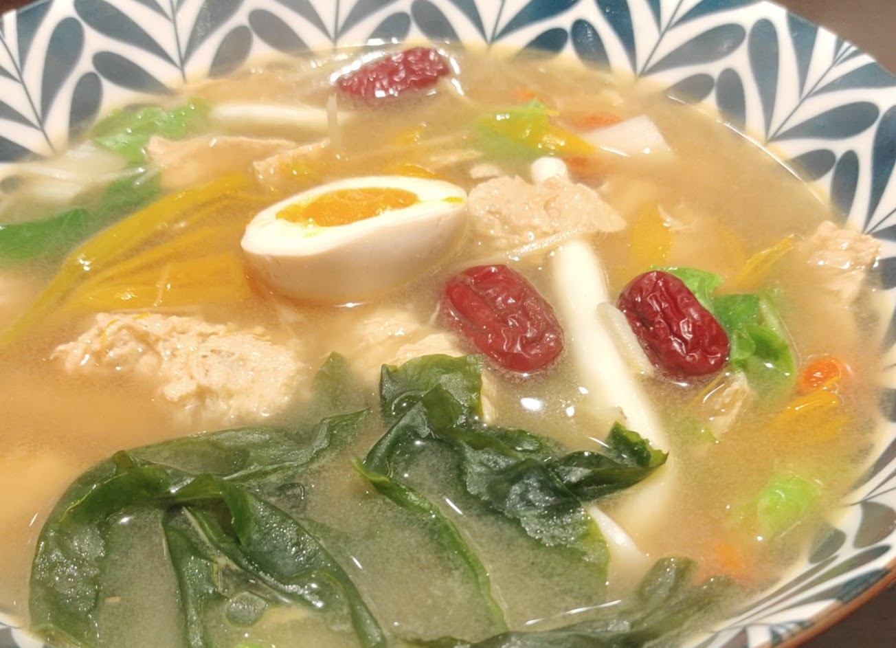 點了豚骨和麻辣都覺得很不錯?裡面有魚塊、小卷、蛤蜊、蝦子,還有小白菜、海帶、半顆溏心蛋,料很豐富,烏龍麵麵體也很Q彈。