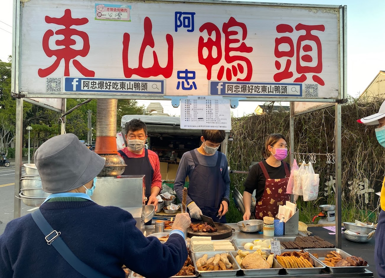 阿忠東山鴨頭在朴子夜市入口攤,其光酥香脆現炸鴨頭、鴨翅及小肉豆、米血和百頁豆腐都很熱銷