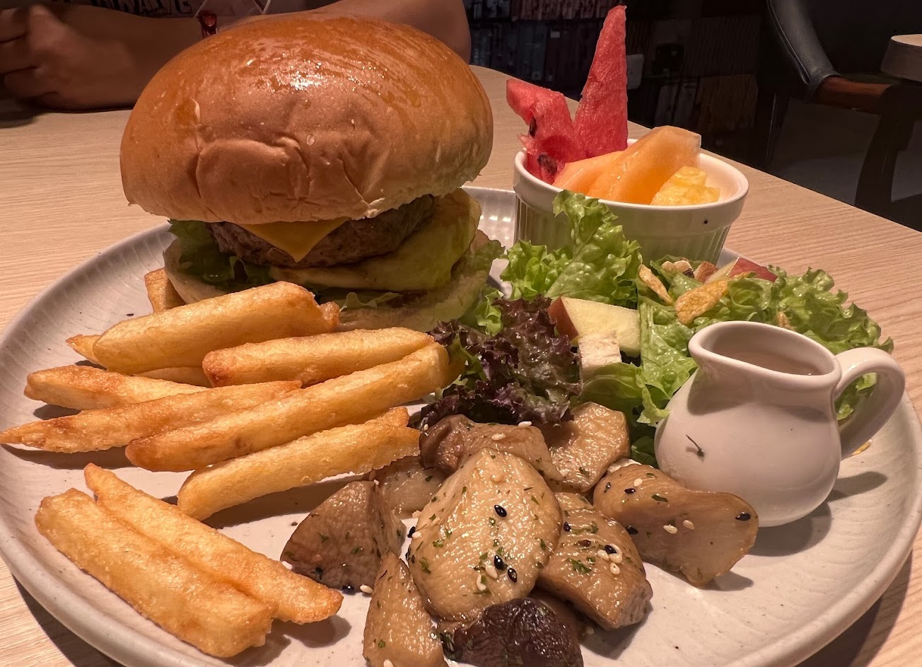 漢堡本身好吃不說,原本以為是馬鈴薯塊的原來是杏鮑菇,我覺得處理得非常好,完全沒有菇腥味,保留了鮮味,而且調味也剛剛好。價格上雖然不是非常親民但也不算貴,如果以同行人點的義大利麵來說還算滿一般的價格的。