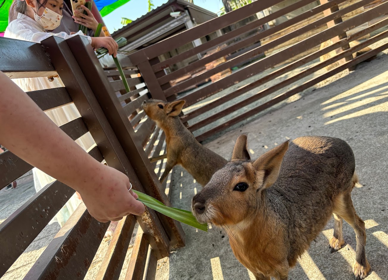 買了一人僅限一把的牧草(要小心會有點割手),讓小朋友與駱馬、捲毛豬、迷你騾、山羊等互動,也是這次我才知道原來水豚比我想的大很多。