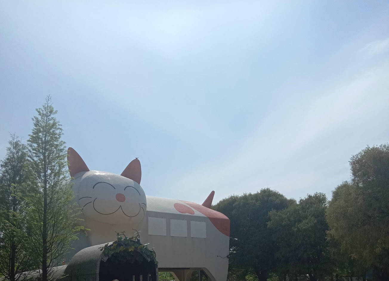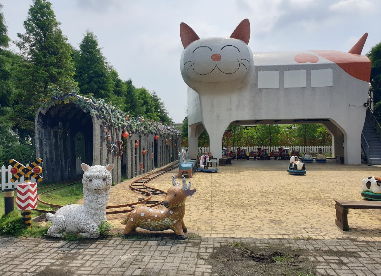 園區的擺設都以動物及童趣為主,加上一點古早味 往後方走過一段階梯,又是另一處園區 有落羽松、戲沙場、貓咪車站、小火車與娃娃車