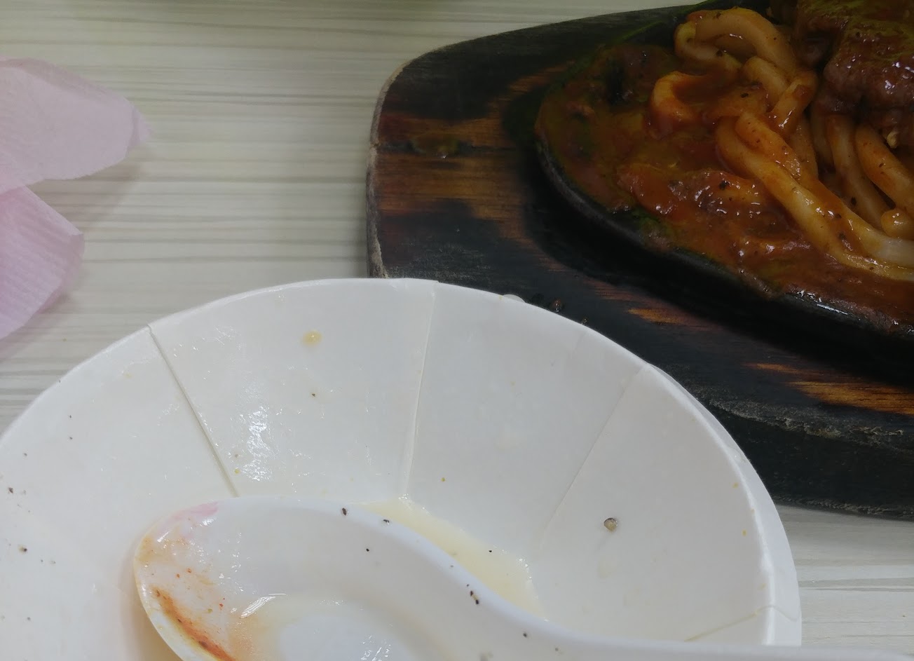 肉質 麵條 口味 份量都很可以,態度也蠻親切。 但是沒有”鐵湯匙&餐巾紙”真的很不習慣,鐵板夠燙所以我們必須站起來後退怕噴到衣服,也因為鐵板夠燙卻不能翻蛋很惋惜,因為本人吃牛排喜歡完整半熟荷包蛋。 玉米濃湯(很淡)用紙碗也很難端,鍋子那麼低(大概比腰還低)也不加蓋感覺衛生堪優(抽菸走過去菸灰也會飄進去)。 今晚9點用餐只有我們2客人,上餐後有位弟弟已經開始整理桌面,整理我們右邊餐桌時,把胡椒罐轉開把蓋子直接往地上甩一堆胡椒粉,我超怕吸到打噴嚏的?希望這些地方能改進一點。