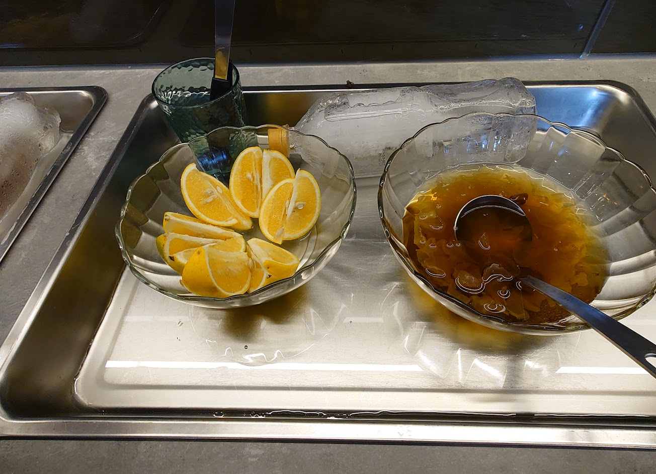 自助吧有3-4樣涼拌小菜、水果沙拉、炸物(南瓜、花枝丸、薯條)、自熬蔬菜咖哩和湯物,還算豐富,當然也有基本的咖啡、茶包