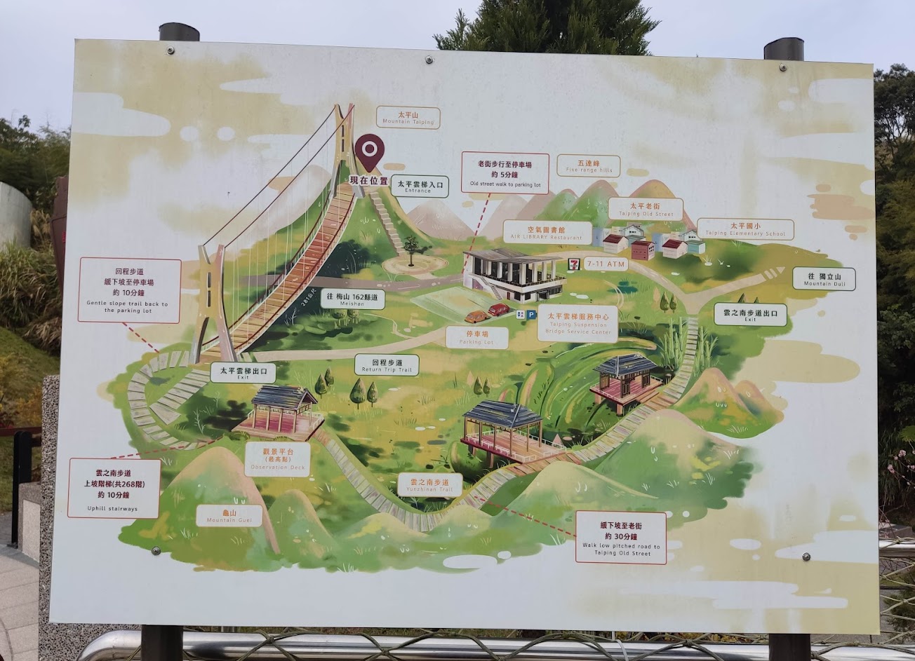 這是一個非常穩的吊橋 對我這種有懼高的人 非常友善 上來的時候是坐107公車 36個髮夾彎,司機很專業 坐上來後;司機會問你要不要乘車證明 可以折抵門票20$(門票100$) 風景很漂亮,附近有太平老街和空氣,圖書館 很適合走走拍照?