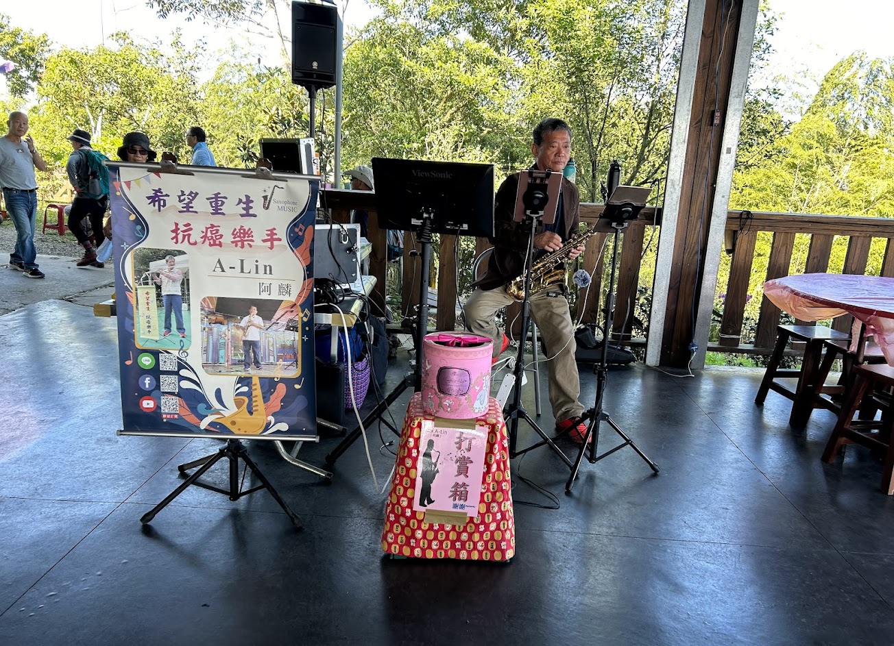 虎爛亭太多人,所以我改去下方的涼亭休息,邊聽現場薩克斯風演奏,邊喝金桔檸檬汁,真舒服。