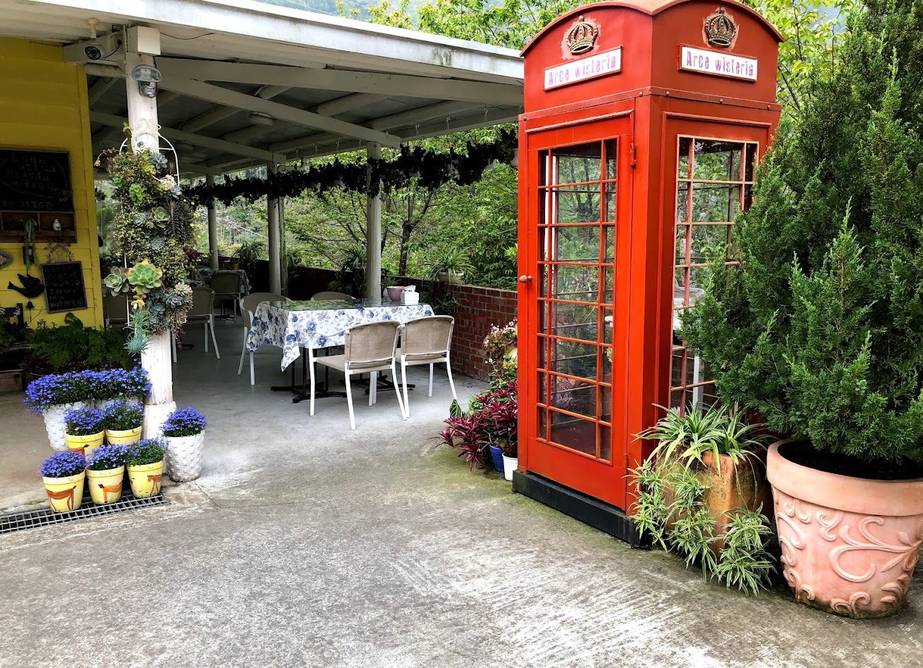 在盛開的紫藤花下享受下午茶,浪漫指數破表。花草養護佈置用心。