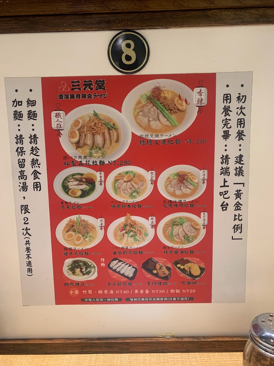 在南機場夜市中才剛歇業了一家知名拉麵店後,位在夜市邊陲、處三元街和南海路的大十字路轉角口上的這裡恰好開了顯眼的這家拉麵承繼了這區塊的拉麵重心,大紅色的招牌燈籠將整棟樓都做了醒目提醒,而店內雖然也和拉麵店一般配置有吧檯和共桌,不過店內卻出奇的充滿些濃濃台味。
