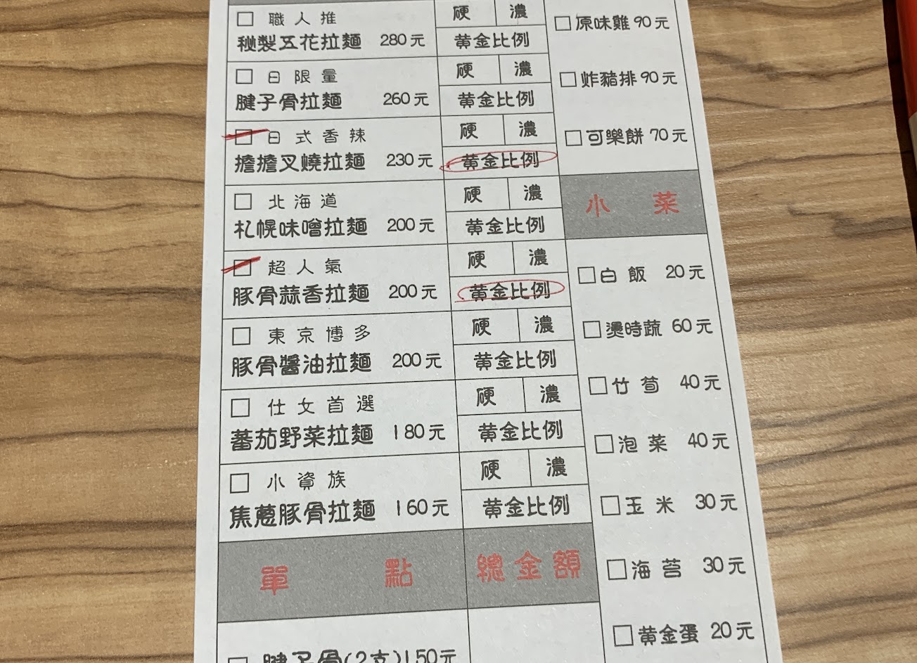 第一印象是服務人員態度很親切,詳細介紹點餐方式和推薦的餐點。點了小資焦蔥豚骨加一顆溏心蛋,選擇黃金比例(店家推薦這個選項給一般消費者,避免原日式口味太濃太鹹)整體味道很好,湯是可以喝完的程度(只有最後一口時才出現偏鹹的感受)。