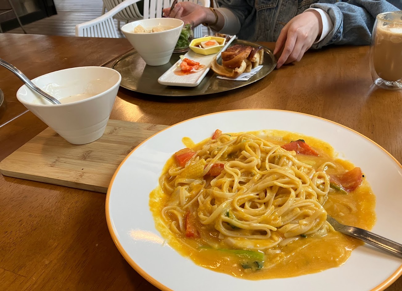 ▫️鬱金香咖喱海鮮麵🍝 麵條軟硬適中,醬汁濃郁,海鮮新鮮,搭上一些蔬菜(四季豆番茄香菇),好吃一直ㄘ~ ▫️抹醬土司&濃湯🍞 跟友人一致認為吐司滿好吃的,鬆軟卻有嚼勁,抹上棕櫚糖很香!單吃或沾濃湯都很棒😍
