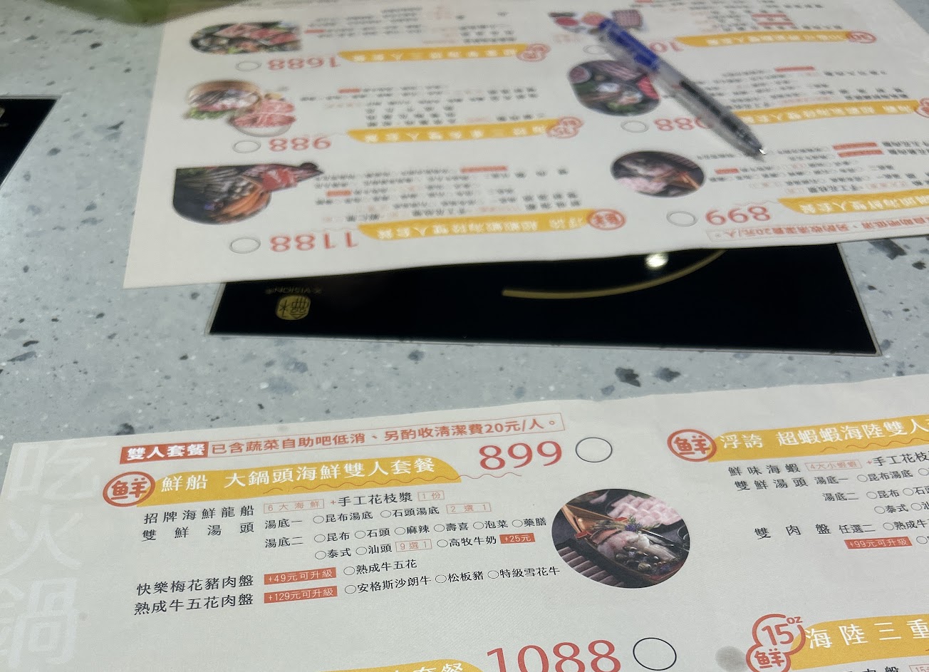§鮮船 大鍋頭海鮮雙人套餐899-2個鍋底、2份肉盤、還有一艘海鮮船。昆布湯底-湯頭清甜。泡菜湯底-不會太酸太辣,煮肉類剛好不用沾醬,也解膩。快樂梅花豬肉盤&+129元升級特級雪花牛-肉盤我覺得中規中矩。海鮮船-花枝、蝦子、魚肉都蠻新鮮的。藥膳湯底+60-湯底來有一包藥膳包,藥膳味道不會太濃烈,是我喜歡的清淡型。小羔羊肉5oz 378-放在藥膳湯內煮過還是有點腥羶味,朋友有搭沾醬吃覺得還好。
