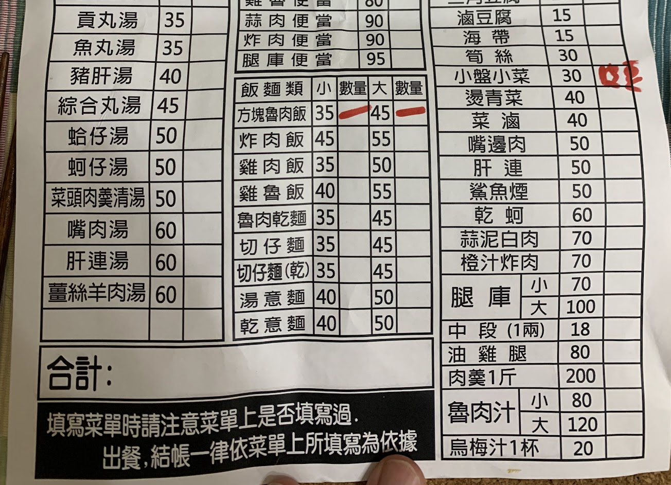 但提醒喜歡吃「滷白菜」的人,菜單上的「滷白菜」叫做「菜滷」哦!放在跟「燙青菜」的勾選項在上下格,很容易選錯,要小心嘿