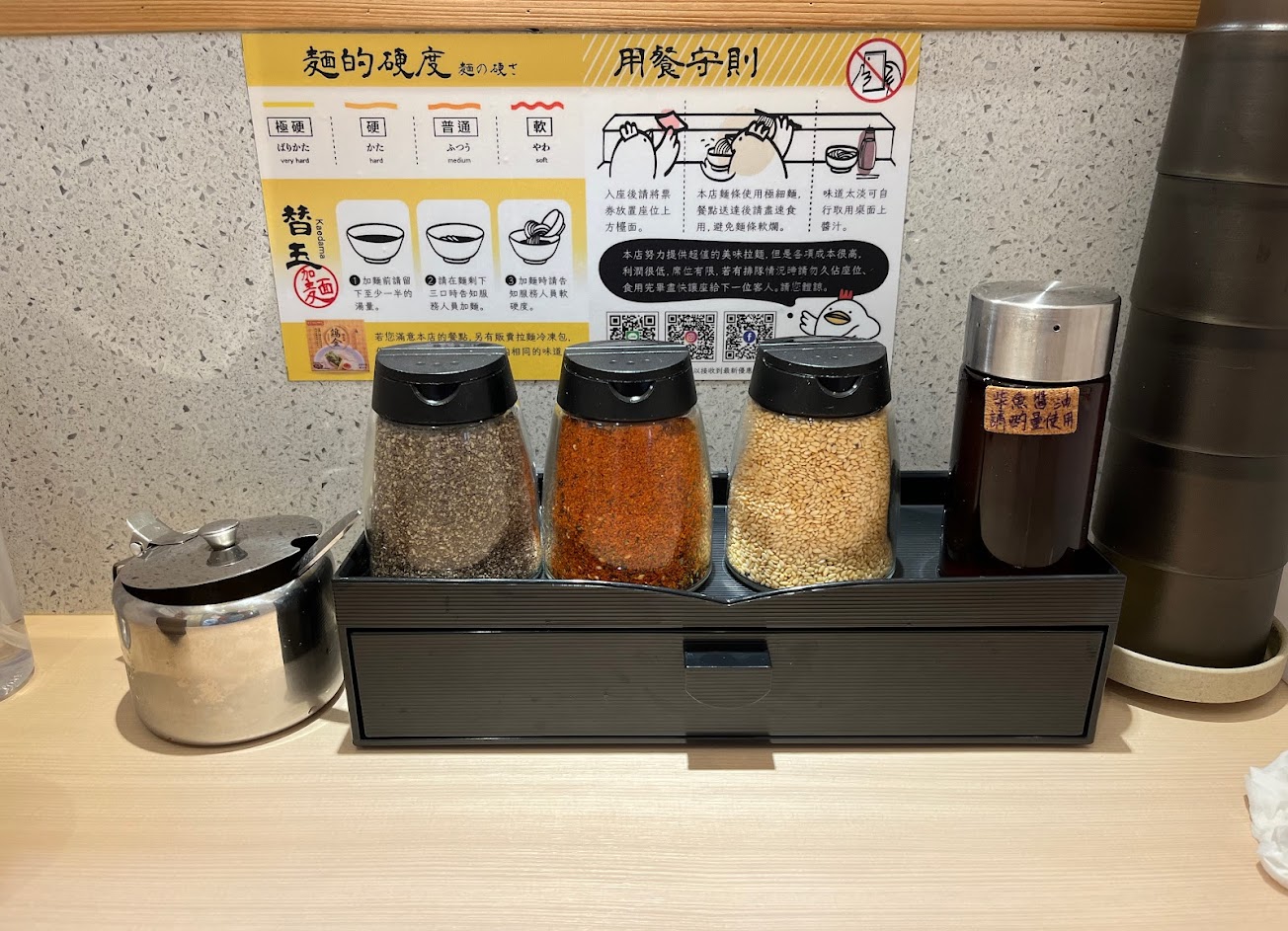 拉麵湯頭濃度偏日式,但調味偏台灣,嫌淡的話可自己調味。單人座位雖不大,不過很適合一個人用餐。