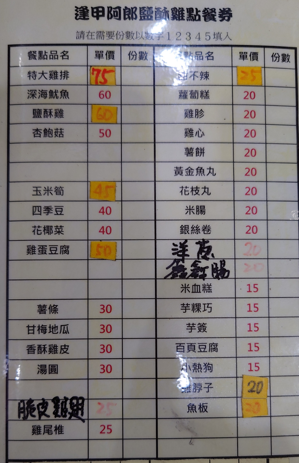 2024最新在地推薦餐廳的菜單_逢甲阿郎鹹酥雞 四維店的菜單、圖片