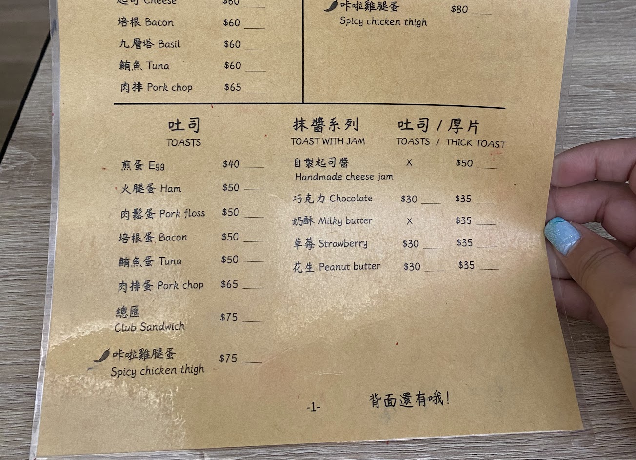 喜歡粉漿蛋餅,起司厚片 服務 內用 餐點類型 早餐 平均每人消費金額 $1-200 餐點:5 服務:5 氣氛:5