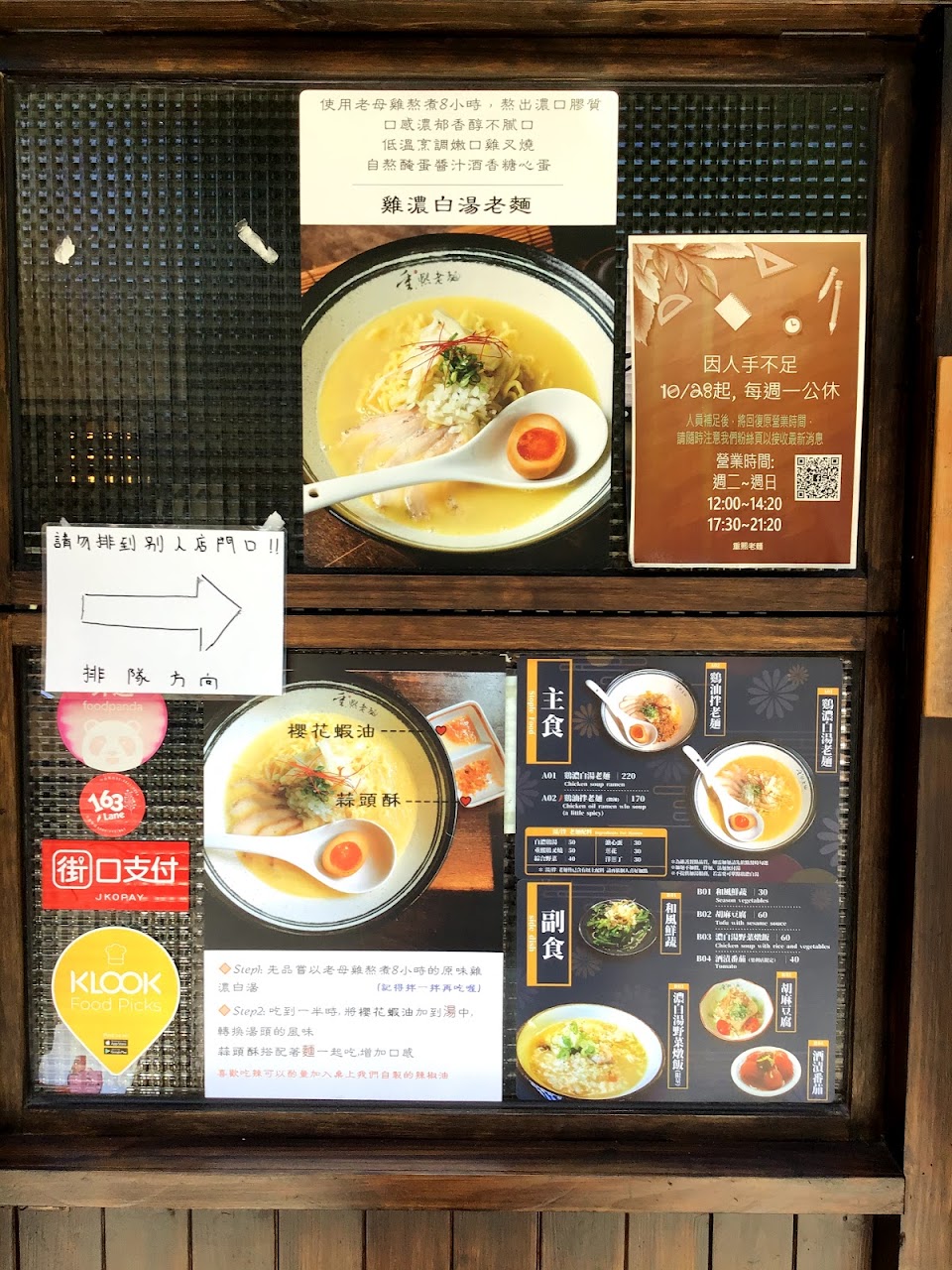 -食物:雞濃白湯老麵$200,湯頭濃卻不會膩,加麵不用錢,附有溏心蛋+嫩雞肉。胡麻豆腐$60,好吃很入味。 -環境:僅6個座位,只可現場排隊,有日本路旁小店的fu。 -交通:正前方馬路有汽車格。
