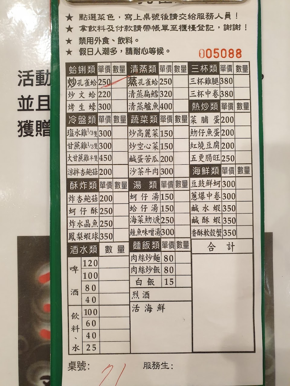 特地從淡水坐渡船來吃孔雀蛤,250一盤,口感很柴,不嫩,大失所望,大不如前,其中兩個還有很多沙子,跟本不能吃。