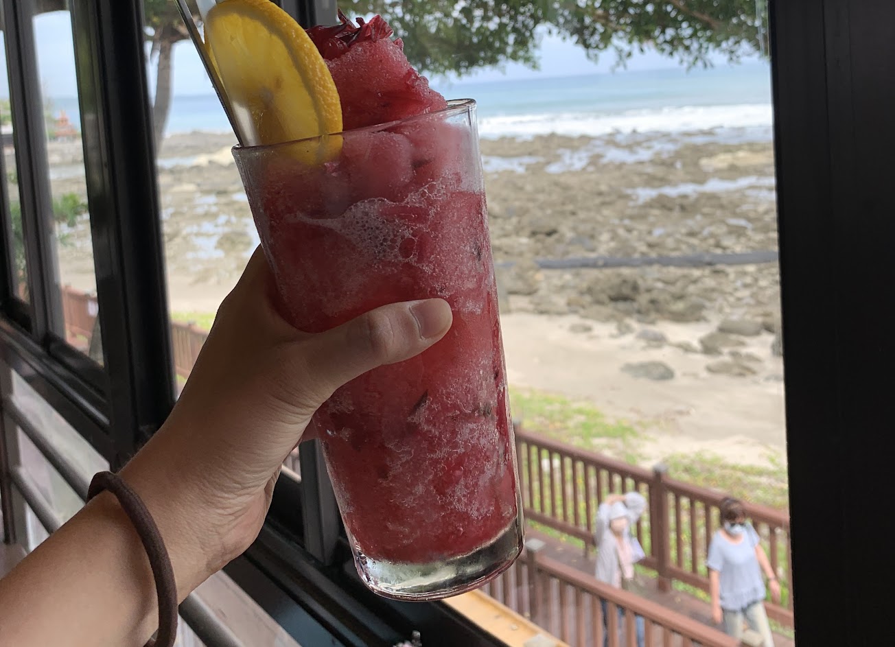 看海景的好地方,以為很熱!但其實海風吹來蠻涼爽的~來一杯藍柑橘氣泡?飲