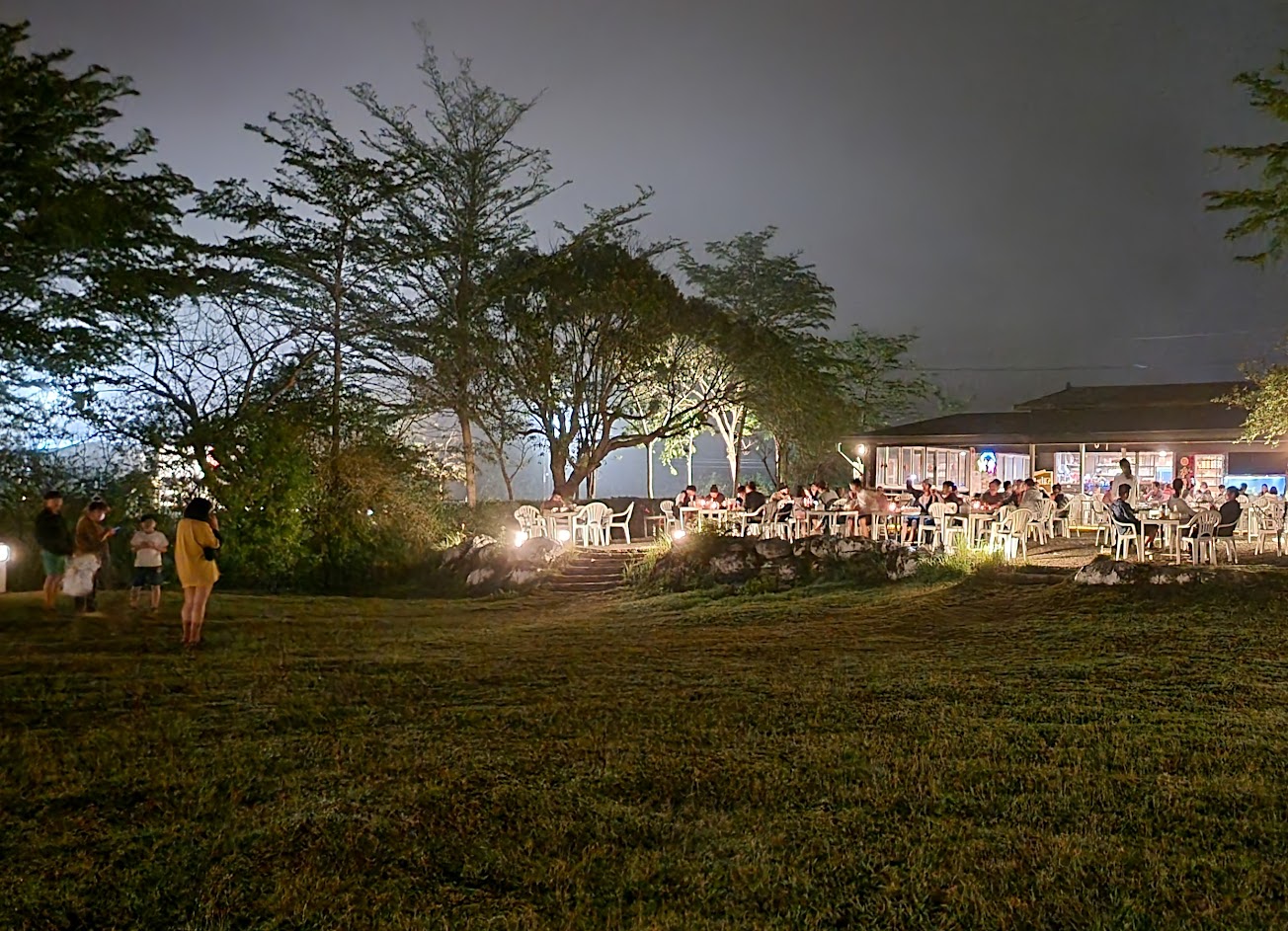 前面是一大片的草原 可以往下看到台東夜景 座位大部分都是露天的 也有兩桌左右是在屋簷之下