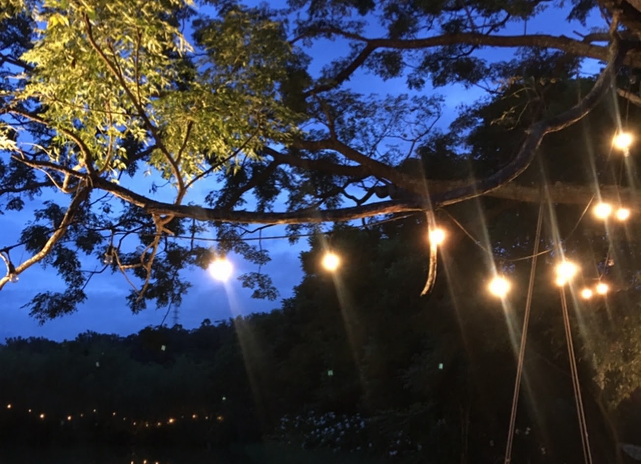 一棵池塘邊的大樹,一只鞦韆,營火被大石圍繞,竹製浴間掛著閃爍燈火,