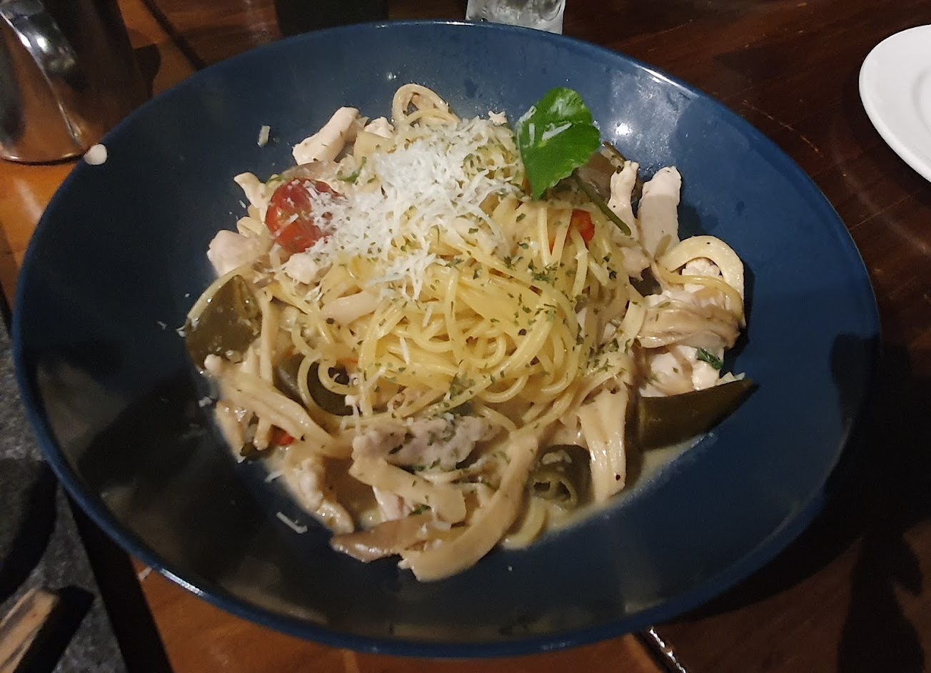剝皮辣椒雞肉義大利麵:較台灣味的口味,細義大利麵不會過度軟爛,雞肉不柴,但可惜剝皮辣椒滋味被白醬蓋過,僅感受得到微辣口感而沒有太令人驚艷