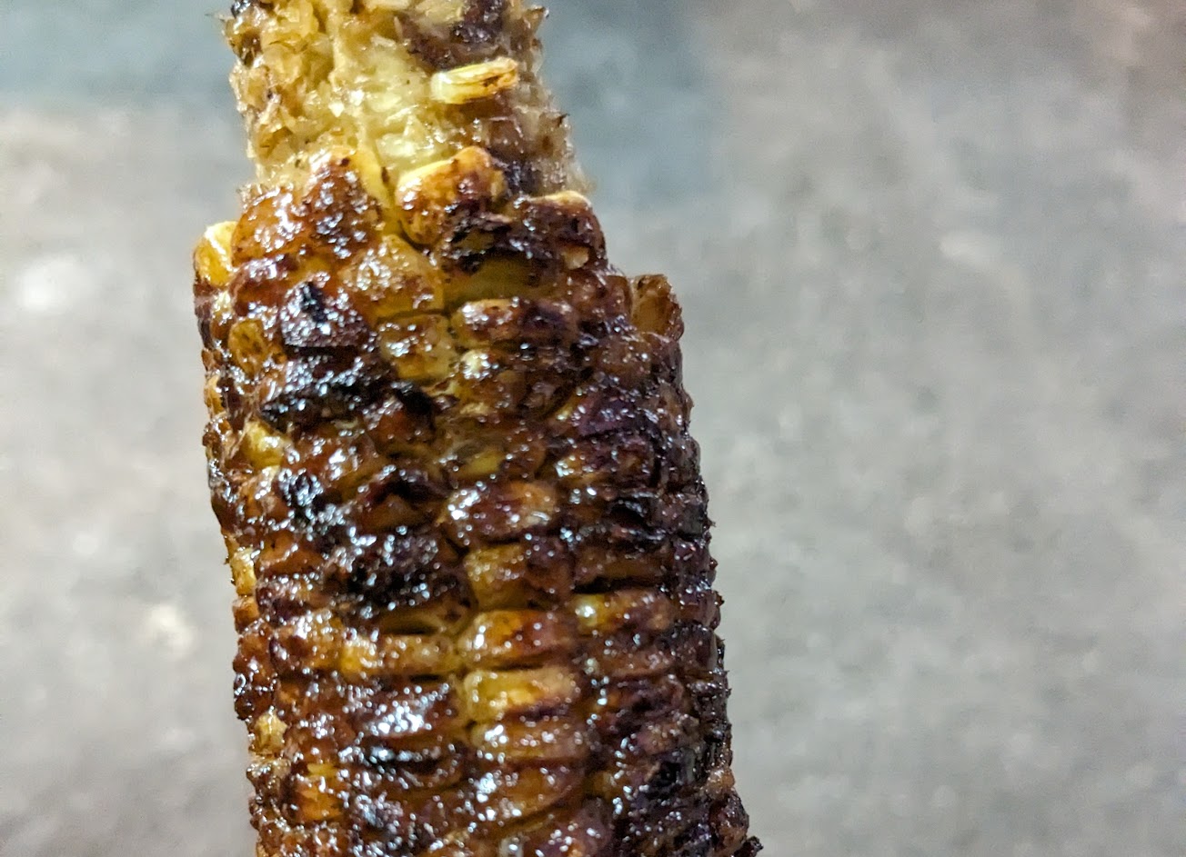 感覺是先炸過再烤,真的整支都燒焦硬梆梆的,而且一支100也不便宜,吃起來完全沒有玉米的香味,很失望