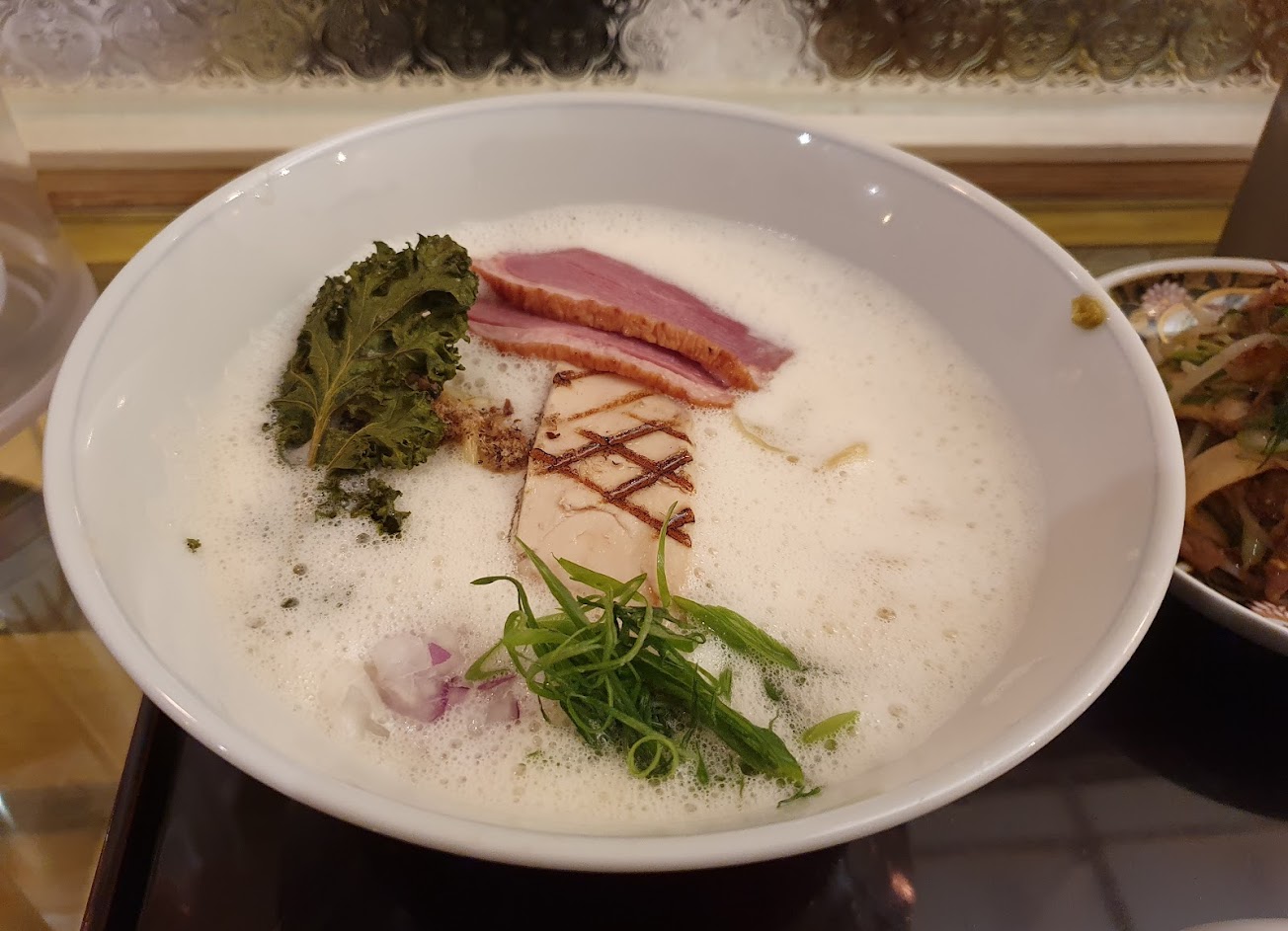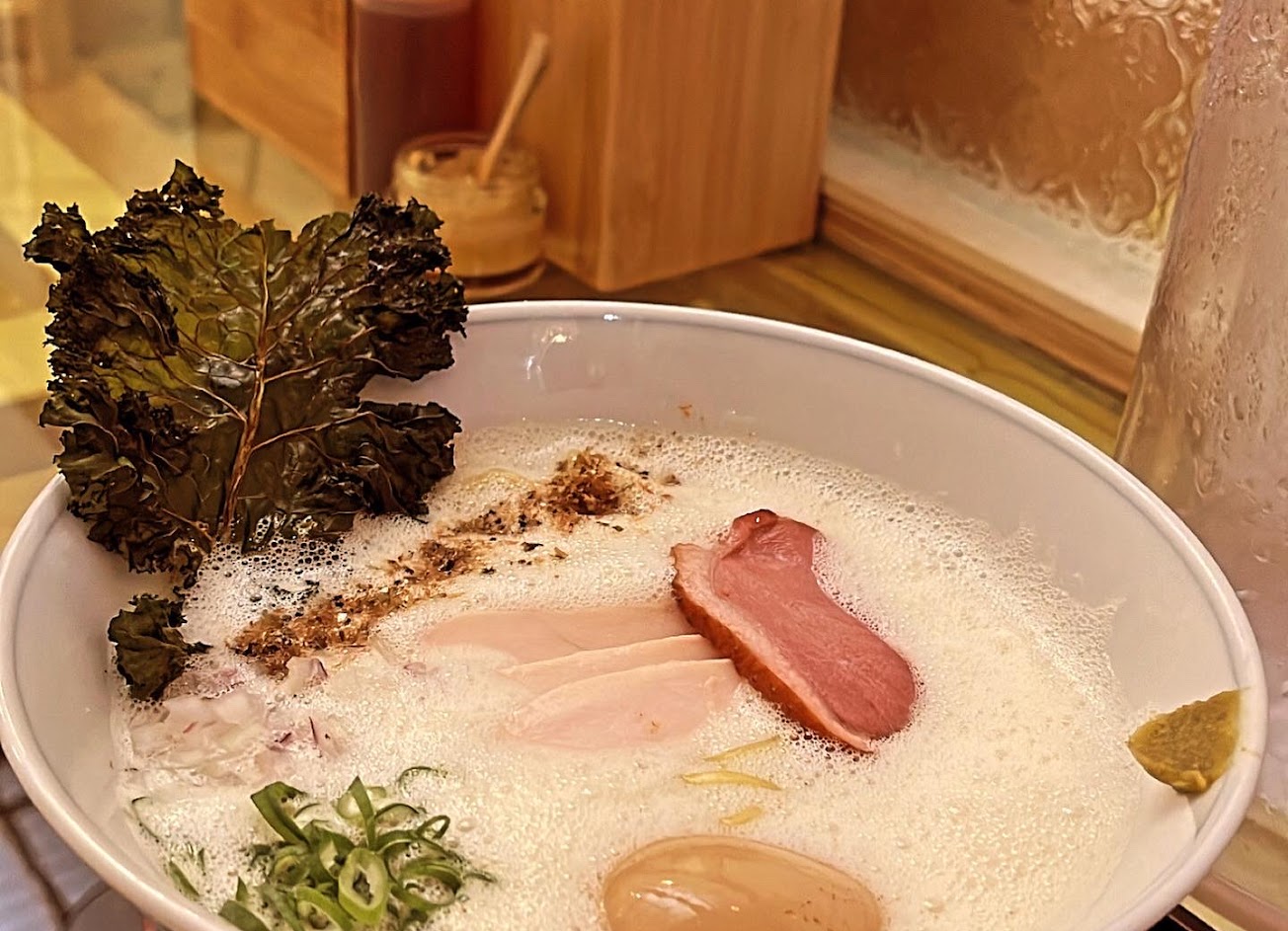 (雞鴨白湯、特製中高加水中華麵、雞鴨叉燒、羽衣甘藍、洋蔥、蔥)