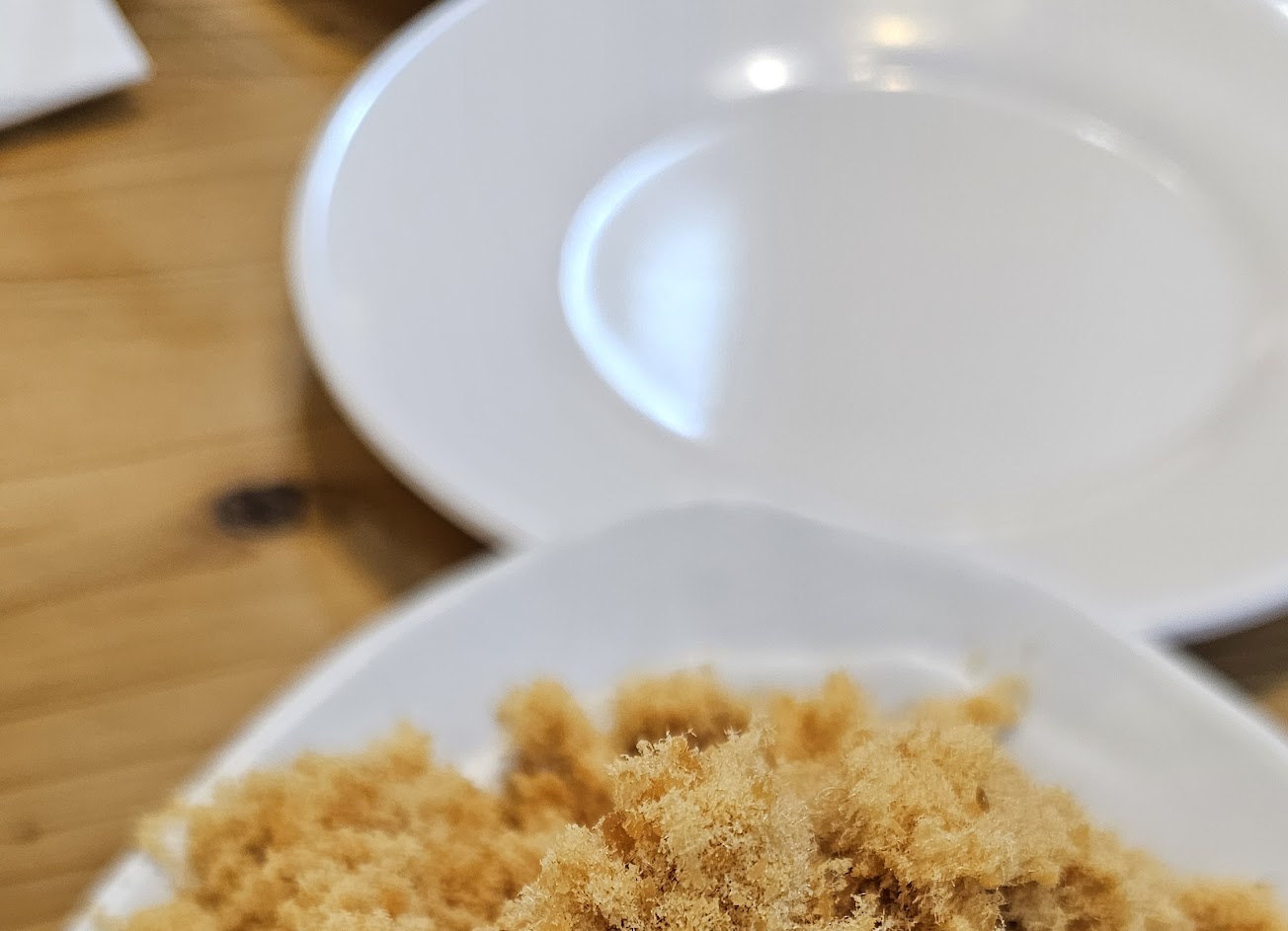 香菇炊飯的煎魚排好吃!可搭配店家提供的魚鬆試吃一起吃