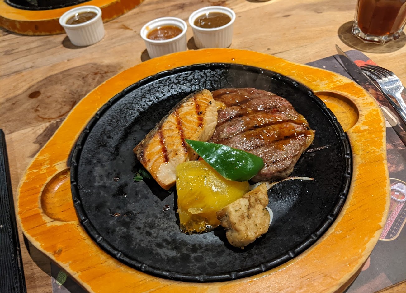 點了鮮魷搭配沙朗牛排跟蒜辣炒蝦搭配菲力牛排。