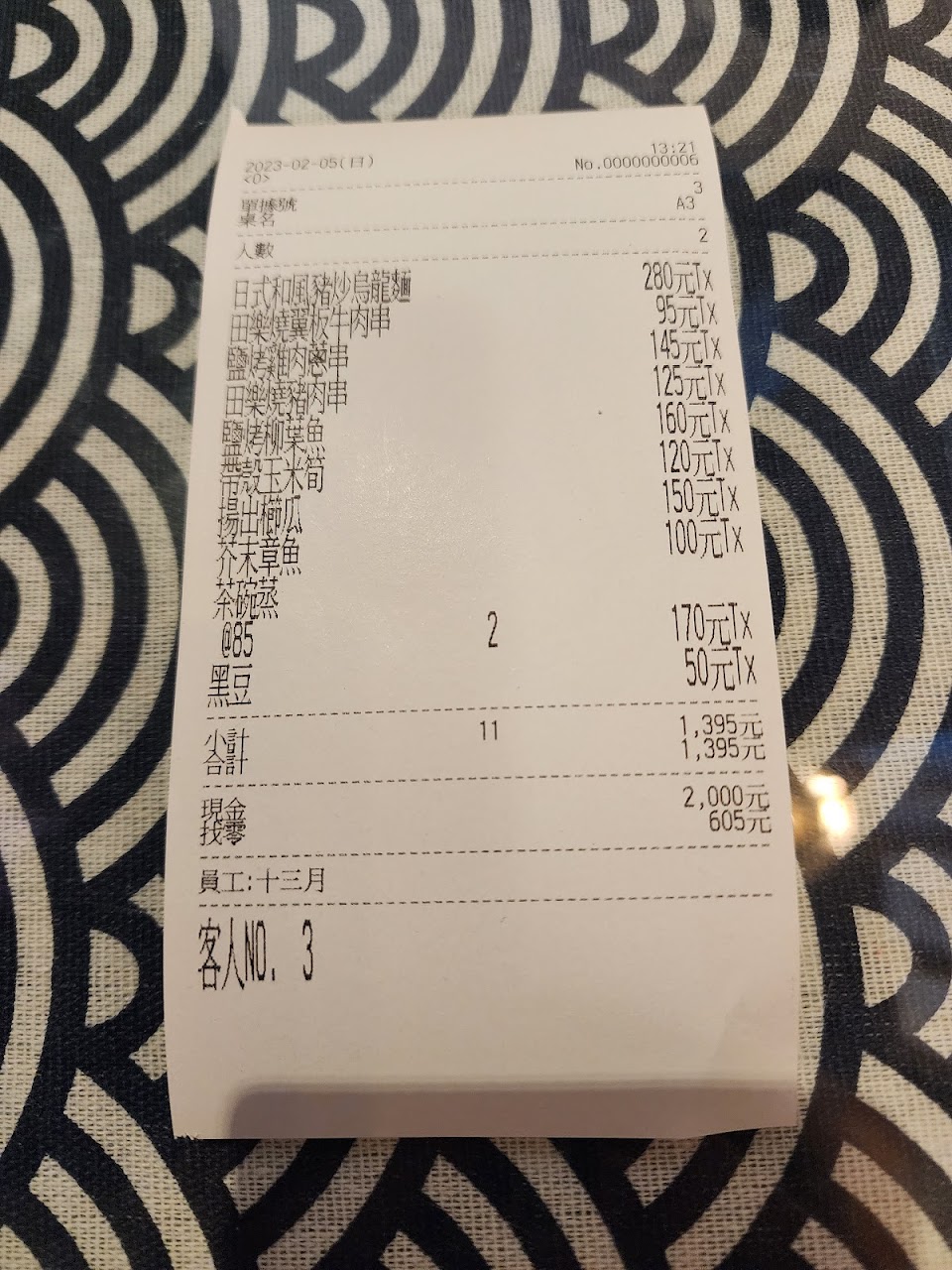茶碗蒸很死鹹,玉米筍很不新鮮,吃起來像泡過水,且梗是黑的,烤雞肉串肉質很乾,這些都算蠻基本款的東西卻不太行,唯一還行的只有小火鍋吧。
