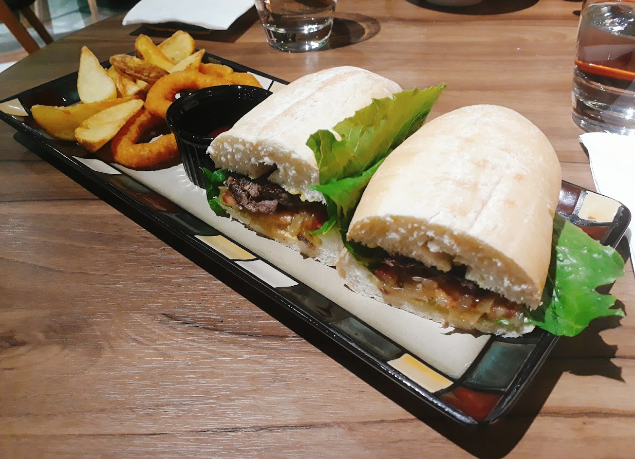 價格合理 但不算便宜,另加一成服務費 豬肋排口味是台式不是美式那種,擺盤滿好看,口味稍鹹很下飯 漢堡是潛艇堡切半的樣子,還附薯條沙拉和飲料