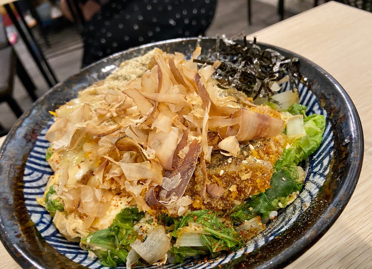 月見牛肉丼,不好吃。湯汁太多底部都積一灘了。味道很淡,好像再吃青菜豆腐湯泡飯了…