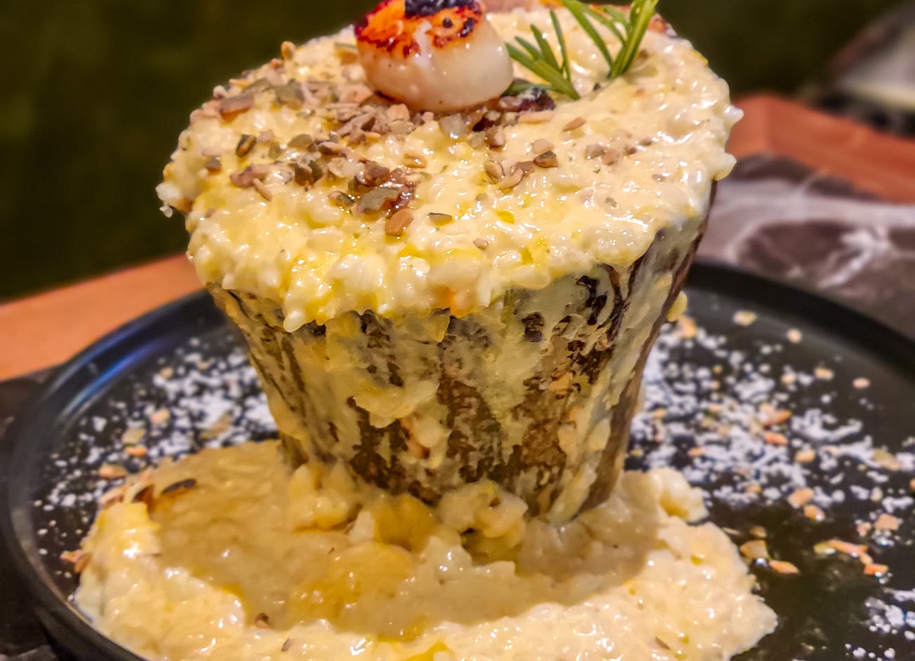 南瓜燉飯:需要提前預訂,以整顆南瓜包裹燉飯,看起來非常有創意,用料也非常實在,一顆干貝、和菇,佐上大量的起司,結合燉飯本身的奶油,整體奶香十足,十分濃郁。(建議分食,以防吃到最後偏膩)