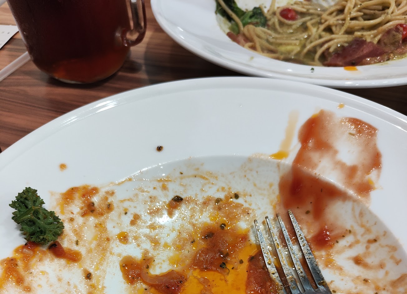 今天點了BBQ大雞排番茄燉飯跟叻沙薑黃蕈菇雞義大利麵加A套餐及炸豬排一份,總共674元
