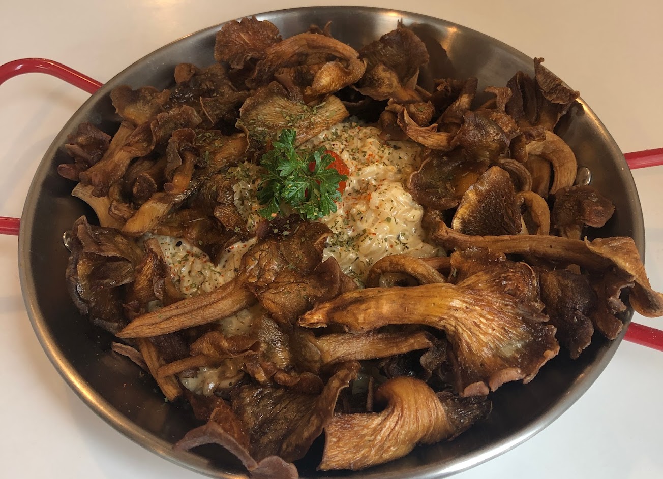 燉飯上巴着滿滿的香濃菇醬,即使份量較多吃到讓人膩口,但吃了炸菇轉換口感,讓人停不下來。
