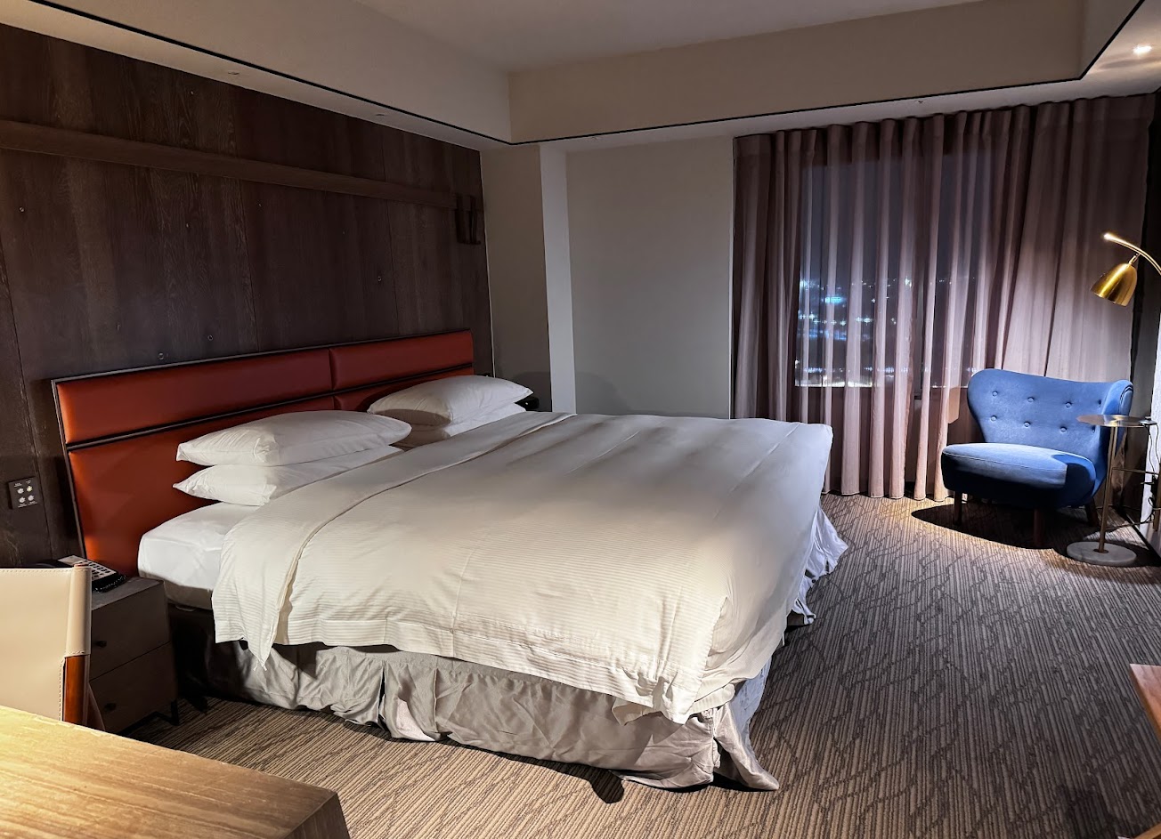 客房裝潢為沉穩的木質調,窗邊有個悠閒的沙發區,高樓層房還能遠眺太平洋,房內有mini bar及迎賓小點,備品為喜來登御用品牌,品項齊全,King Size 的床鋪又大又好睡。