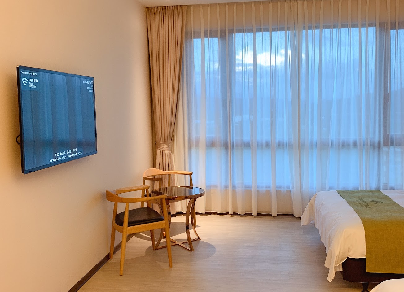 ?房間: 每層樓設有飲水機(應該都在1號房對面),走廊相比大部分的旅館寬敞得多,盡頭有大面窗戶映入窗外的景緻。房間包括浴廁空間都非常寬敞,浴室廁所採乾濕分離,馬桶也有蓮蓬頭可沖洗很貼心。電視可以連結Youtube,另外除了基本茶包外也附上迎賓點心,窗戶外映入山景,住起來舒適放鬆沒壓迫。