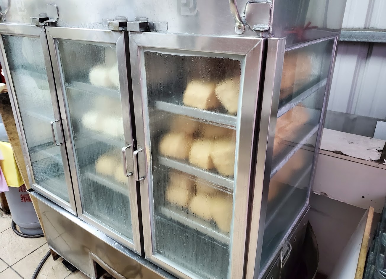 位置少、人多、天熱、油煙味重,就外帶回飯店吃。饅頭好大、飲料大杯。就早餐~