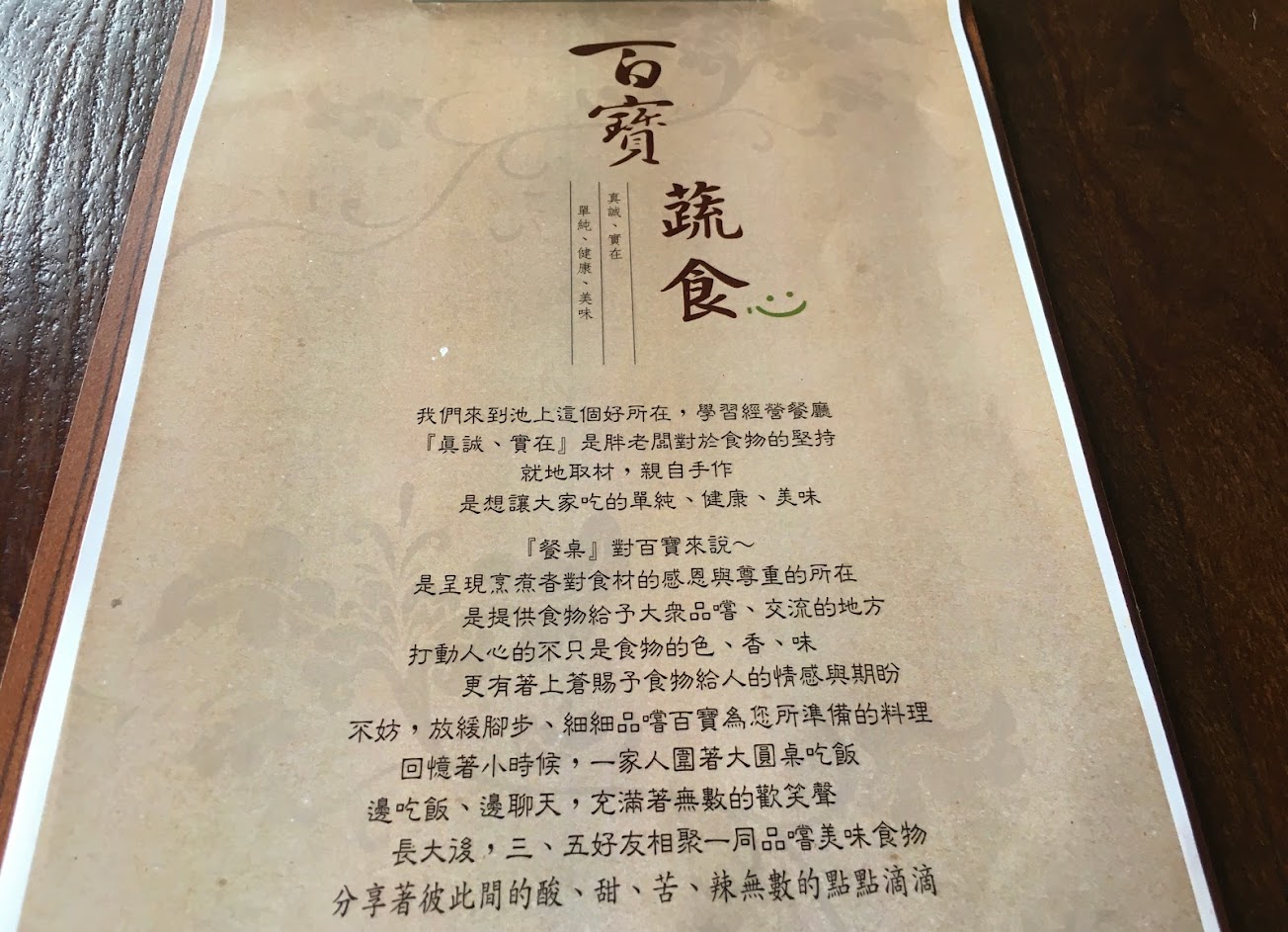 好吃,你就多吃點。有一個長輩說,遇上你愛吃的東西,就要多吃些,心情就會很開心。所以每次只要到了池上,對於無肉不歡的我來說,都會到百寶找老板報到,請他推薦今日主餐。真的很合我的口味,健康又營養。下次去,還要吃^0^ 老板和老板娘在空檔時間也會走出來和我們聊聊,不只是談他們做的菜,也談他們為何會選擇到池上~親切又和善。加油!