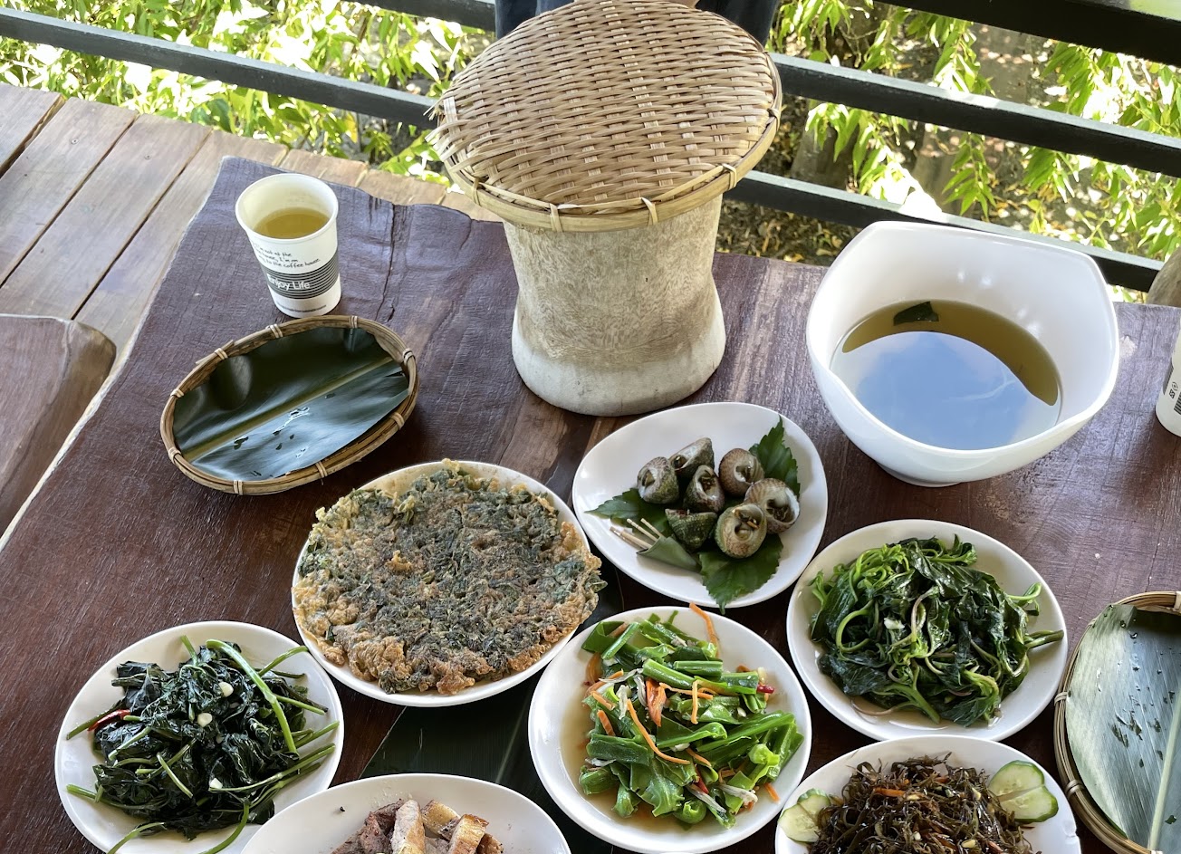 達麓岸部落屋會依據人數調配份量,即使只有兩個人也可以享用,11菜1湯1飯的料理有著天然野菜、烤豬肉、煙燻魚乾、炒時蔬、野菜湯和糯米飯,吃完覺得無敵滿足。