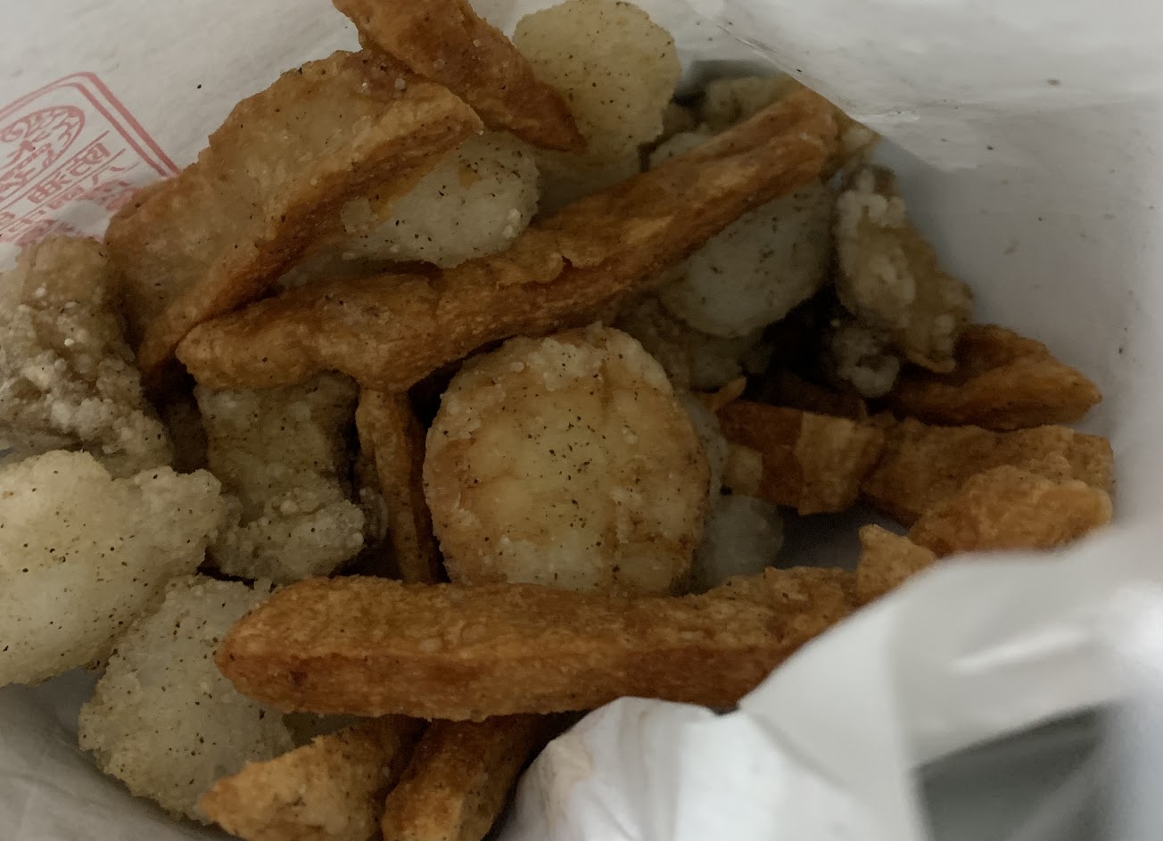 點了雞皮 柳葉魚 魷魚 鹽酥雞 雞蛋豆腐 銀絲卷,每樣都很好吃!尤其是銀絲卷(甜)~不油必點,建議可以打電話先叫