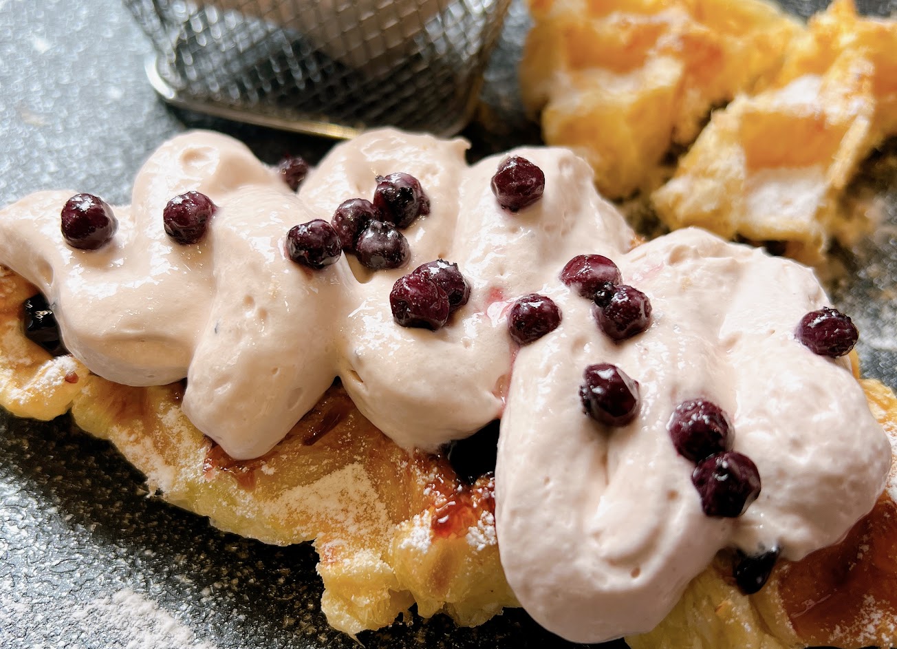 可朗芙很好吃!吃起來像有可頌口感的鬆餅,鮮奶油不會很甜,吃完一份都不會很膩