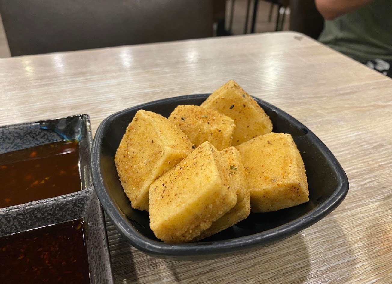 牛匠太郎使用的是水分少口感偏扎實的豆腐,炸衣也是略有厚度,整體上比起雞蛋豆腐的軟嫩版本,更強調咀嚼的口感,單吃味道上較為單調,但搭配上蒜蓉醬,味道相當合拍夠味。