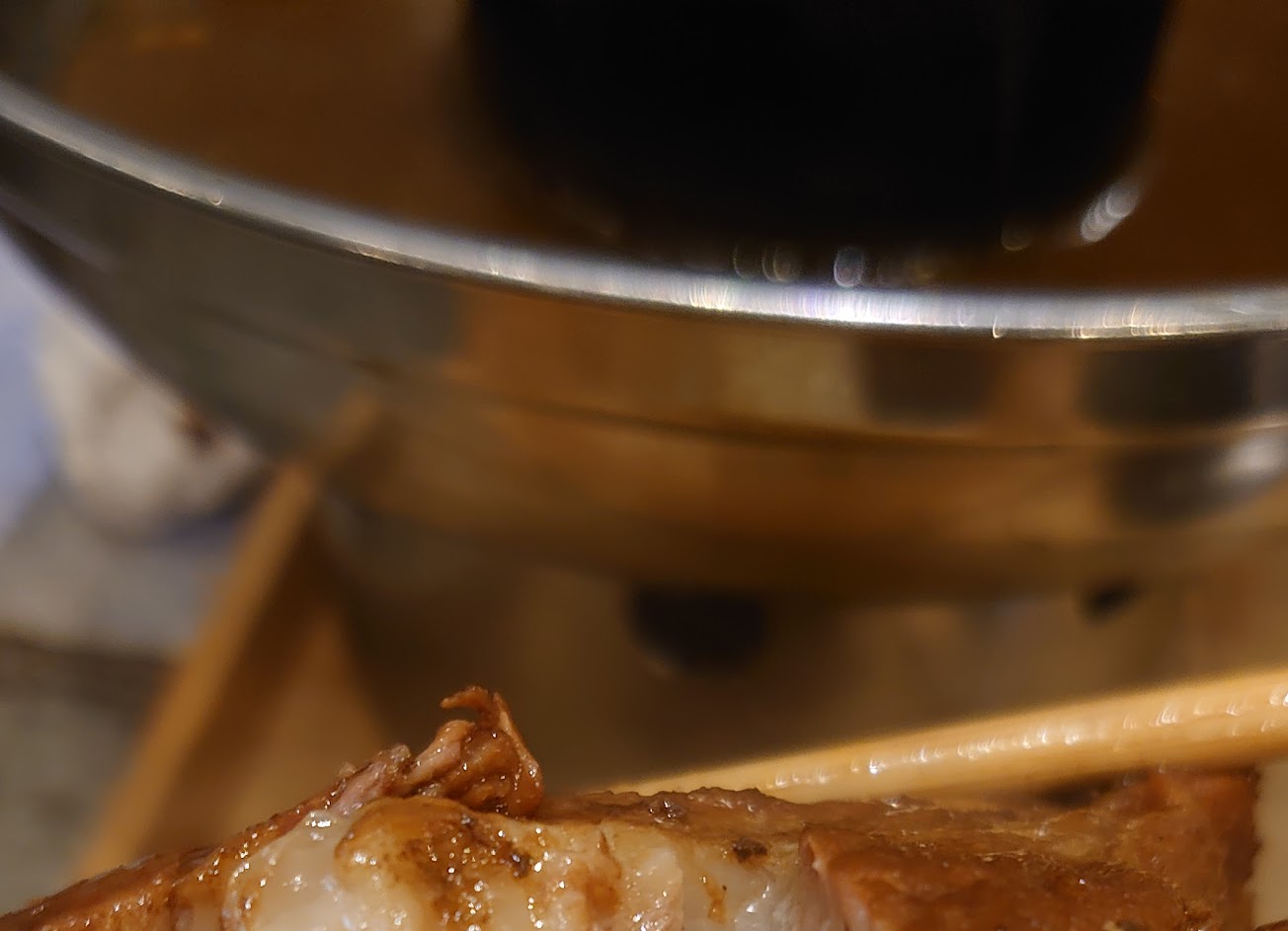 上湯鍋的部分,湯頭喝起來就是一般的高湯,不過裡面擺滿了很多樣蔬菜和菇類,有芥蘭、花椰菜、豆芽菜、洋蔥、香菇、鴻禧菇、秀珍菇等等,然後裡面有兩大塊豬肋排以及2、3片的豬肉片,算是很豐盛的一鍋。除此之外,他們家的火鍋很特別,有別於用一般瓦斯爐或電磁爐加熱,中間的洞口擺放煤炭來燒,所以聞起來有一股碳香,他們還很貼心的替客人準備放骨頭的小盤子,食量大的人也不用擔心吃不飽,這裡的白飯是可以無限續的,而且還有供應免費的烏梅汁,飯後可以解膩。