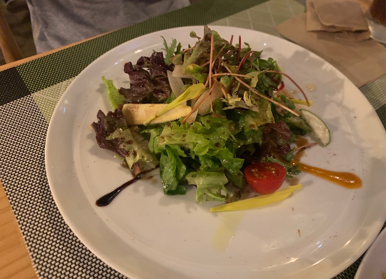 在地沙拉新鮮美味,主餐肉類的熟度掌控很好、搭配烤蒜及剝皮辣椒可以提味,喜歡