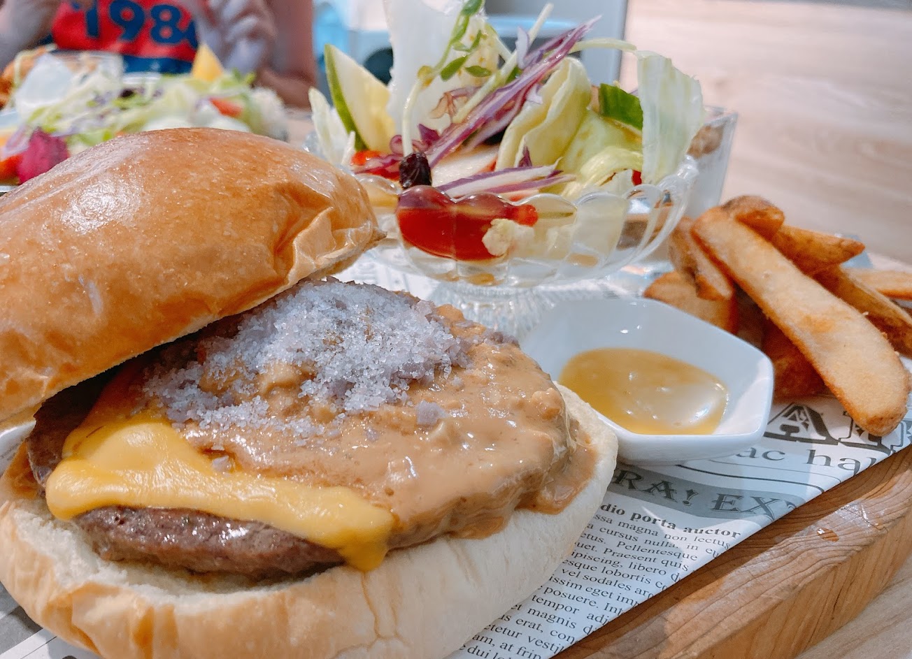 花生跳跳糖漢堡雖然是有點甜的口味,但底下的醬料卻帶出了整體的鹹味以及酸味,將整個漢堡味道的層次感更帶了出來,漢堡有經過加熱烤過,香氣更加充足,整個吃完就已經有7-8分飽,加上生菜沙拉以及馬鈴薯塊以後真的是飽到爆。