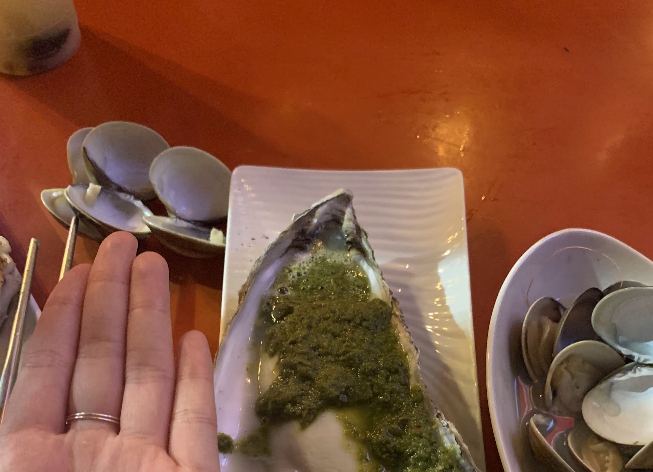 點菜的韓國口音妹妹服務很好,雖然份量都很大份,但 有新鮮就好~生蠔的醬還有烤蝦的味道都很棒!本來已經吃很飽了,因為要等對面的烤肉,點個兩三樣吃一下,結果……忍不住 連店家招待的蝦蝦都吃完了
