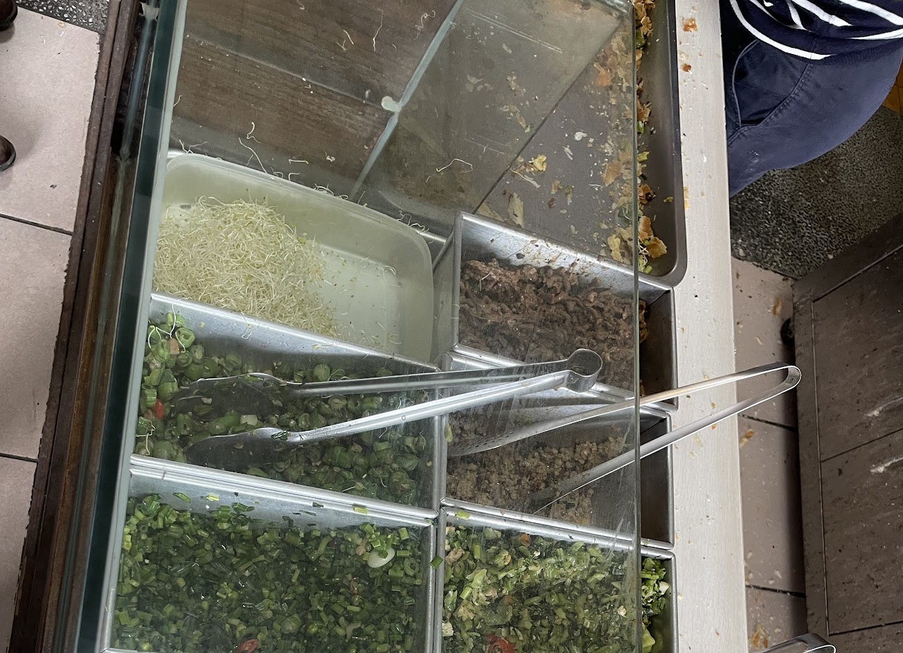 燒餅可自選三種配料,剛好前一梯次的賣完,在原地等待大約20分鐘,所以燒餅是熱的,但稍嫌沒味道,配料點了蔥蛋、青龍辣椒及梅干絞肉,配料部份都蠻冷的,味道還行!煎蛋的鍋子燒焦有點嚴重。