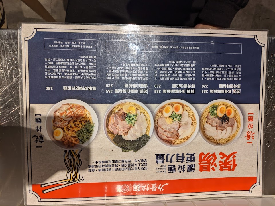 濃雞白湯拉麵(前100組199元),湯頭口味不錯;小碗叉燒飯(80元),非常好吃,量也不會太少,烤肉的香氣足,很推薦;泡菜(50元),很一般價格也不親切;豚骨醬油(220元),湯頭特別也好喝,算很不錯(感覺比雞白好)