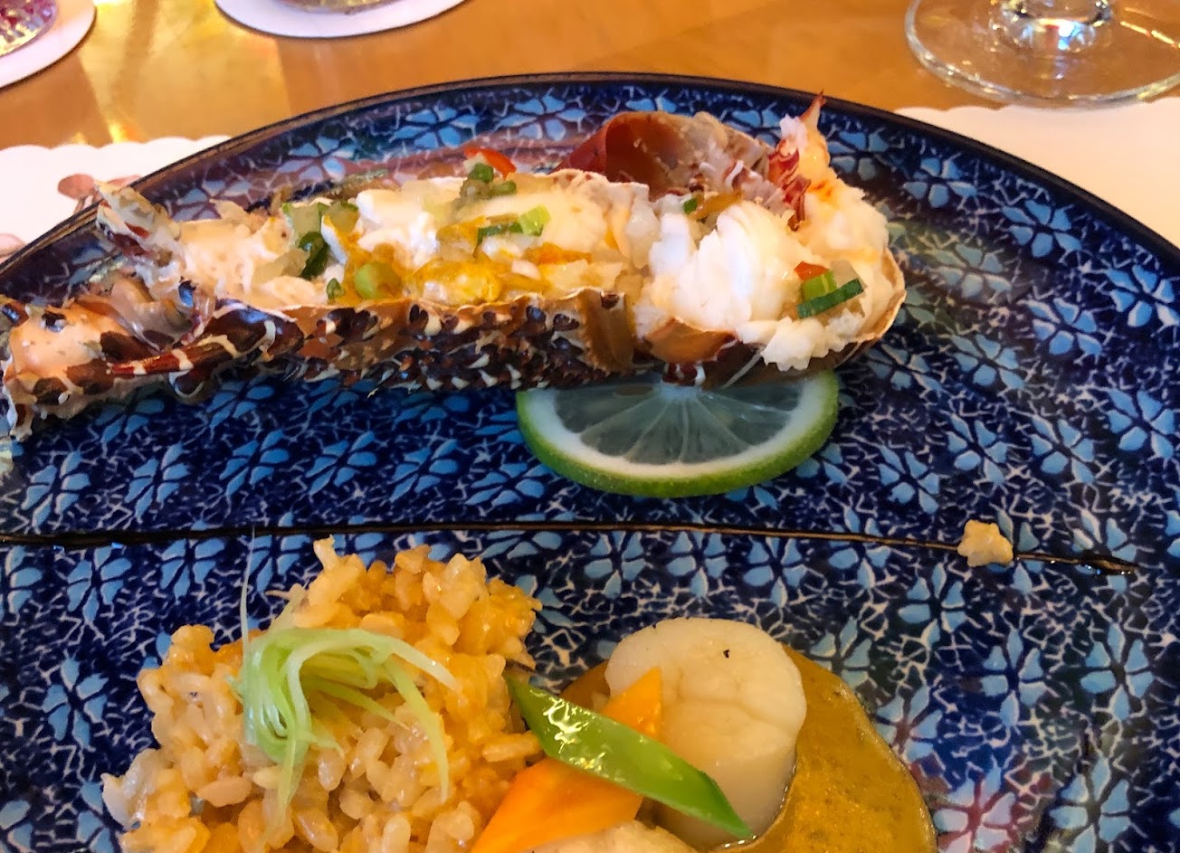 晚餐是無菜單料理,選用的是花蓮在地食材,每道料理都能吃到主廚給我們的驚喜, 精巧細膩的前菜卻用了鰻魚、鮑魚和松阪豬、主菜包含了龍蝦、干貝和燉飯;還有軟嫩適中的羊排,最後更上提供了鮮甜潤口的雞湯。